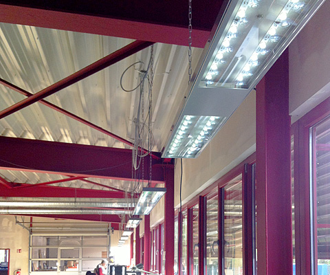 Hochintegrierte LED-Leuchte zur Ausleuchtung von Industriehallen, Lagern, Produktionsbereichen, aber auch von Verkaufs- und Präsentationsräumen. Je nach Optikvariante Montagehöhen 2.5...25m